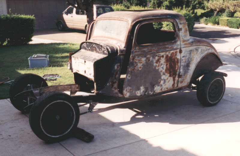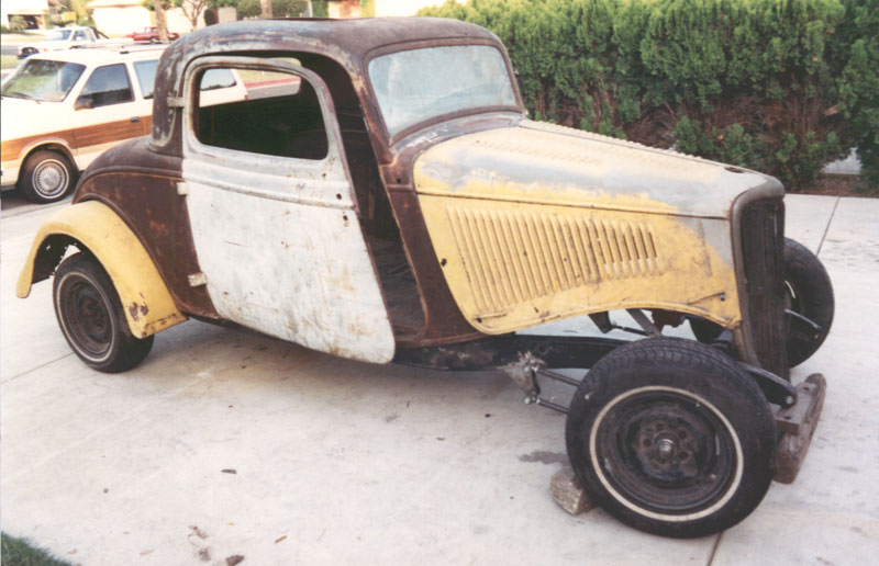 ![]() In 1973 when I was 19, my much older and supposedly wiser brother came to me and suggested we go look at a '34 Ford he saw advertised for $150. What we got is the sheet metal you see here. The body, one rear fender, the rear lid, the doors and the hood. We purchased the grille for an extra $25.It proved to be of no use and now hangs in my garage. |
