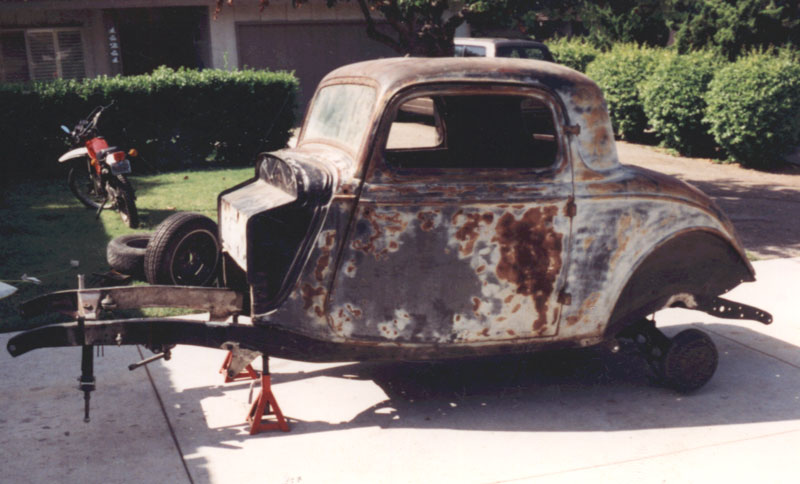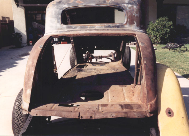These pictures were all taken years later when I finally had the money and inclination to tackle the job. The body had been sitting in either my brother's or my backyards for about 15 years. Somewhere along the line, I swapped an old T10 for my brother's half interest in the car. | |