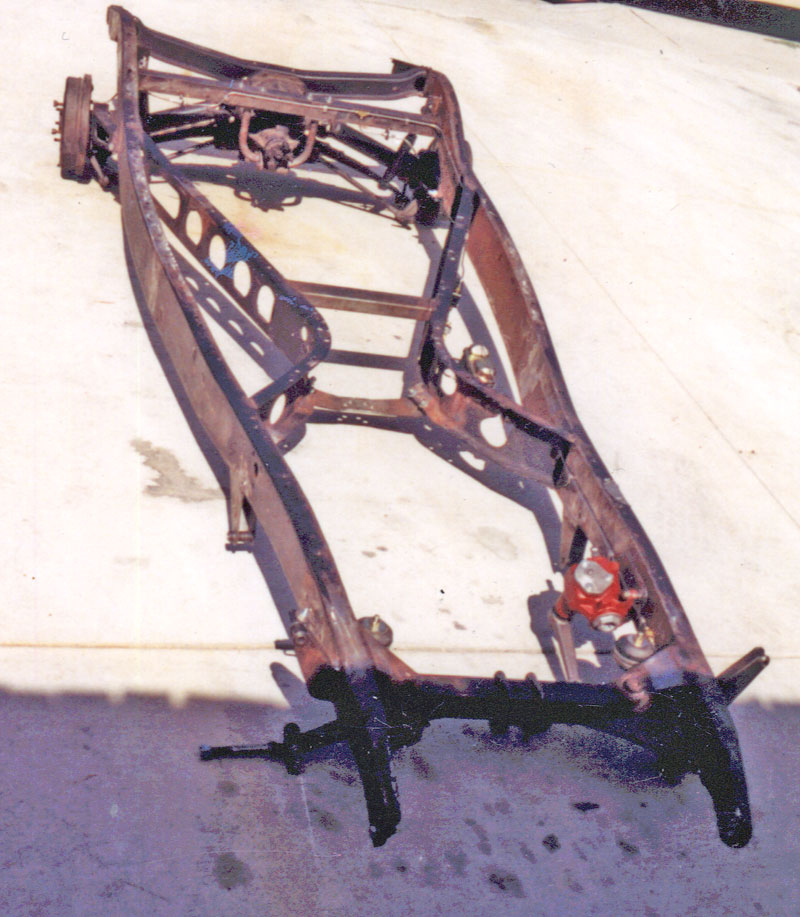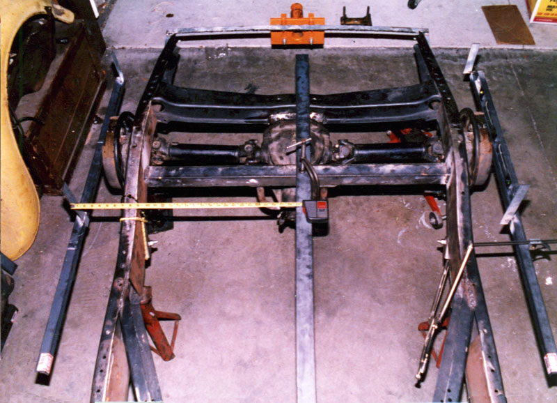 This was one of the most technically challenging, and enjoyable tasks I performed. A friend had hooked me up with a '64 Corvette rear end. It was a steal at $125. By the time I had replaced one half shaft and had the thing rebuilt, I would have been far better off buying a Ford 9". This picture shows how how I setup the center line on the frame and how I used the jigs to setup initial toe-in. I elected to use the stock cross member and weld in a 3/8" plate at the proper angle to mount the center section. |